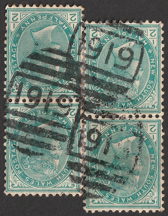 1919 (6.5x15mm) of Federal (RRRR) comp strike, plus 2 others on 1897 QV ½d green recontructed blk of 4. (P) (Image1)