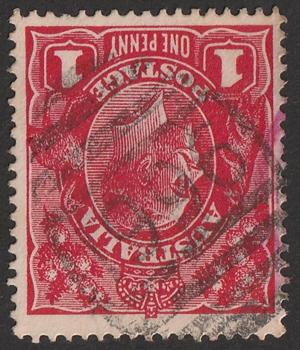 1996 of Bermagui South comp inverted strike on 1914 KGV 1d red. Unrecorded on Commonwealth issues by Freeman, possibly unique. (P) (Image1)