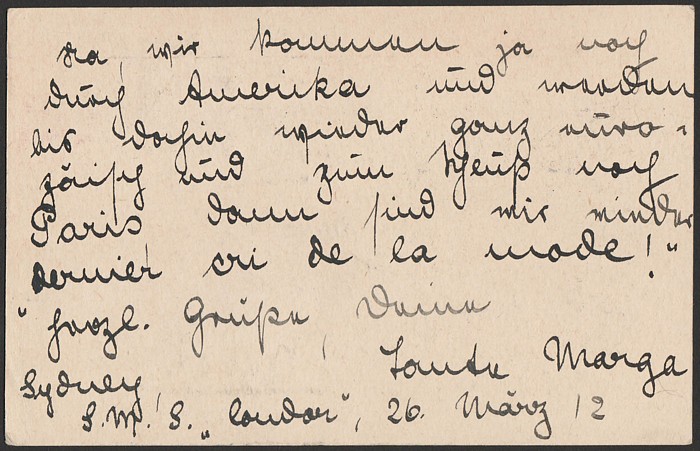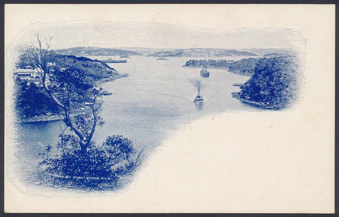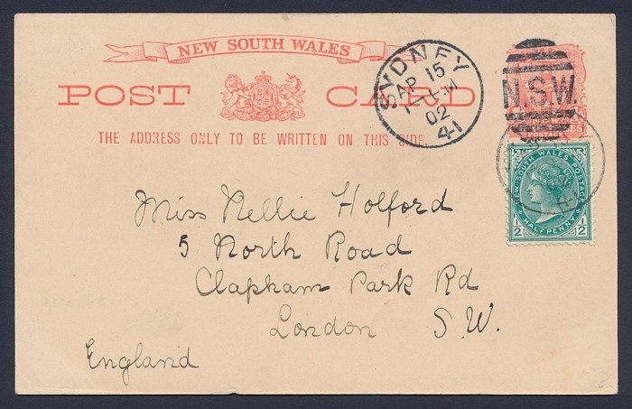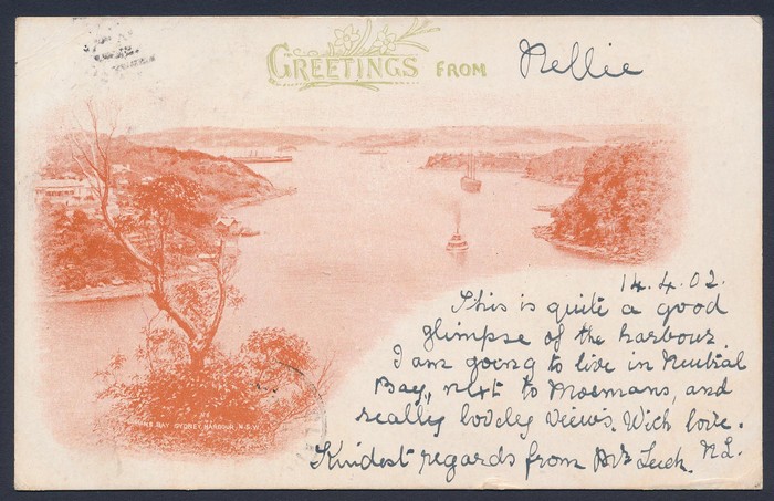 Shield 1d die 1, view 'Mosman's Bay' in brown-red, 'Greeting from' in olive. VFU, uprated ½d, to London, 'Sydney AP 15 02' cds. H&G 19c. (Image1) (Image2)