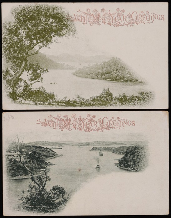 Numeral 1½d blue New Year Greetings views Fairy Dell, Hawkesbury River, Mosman's Bay & Town Hall. VF UN, mostly fresh. PSSA PC23b. (4) (Image1) (Image2)