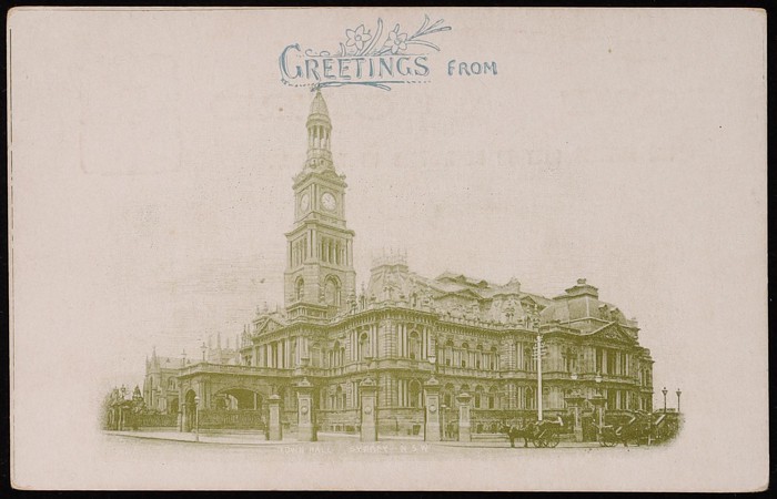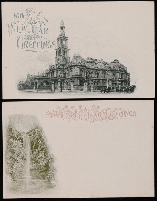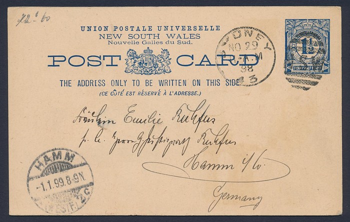 Numeral 1½d blue, view 'Town Hall' in black, 'New Year Greetings' in grey. VFU, to Germany, 'Sydney NO 29 98' duplex pmk 'Hamm' arrival cds. H&G 23B. (Image1) (Image2)