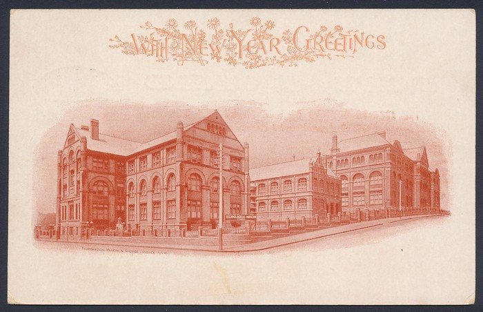 1½d blue view Technological Museum in dark red, 'With New Year Greetings' in salmon-pink. VF CTO NSW oval pmk. PSSA PC23b(var). (Image1) (Image2)