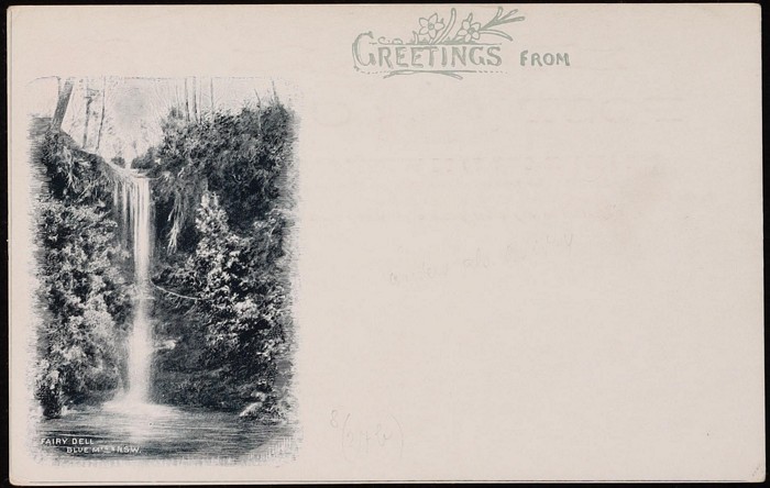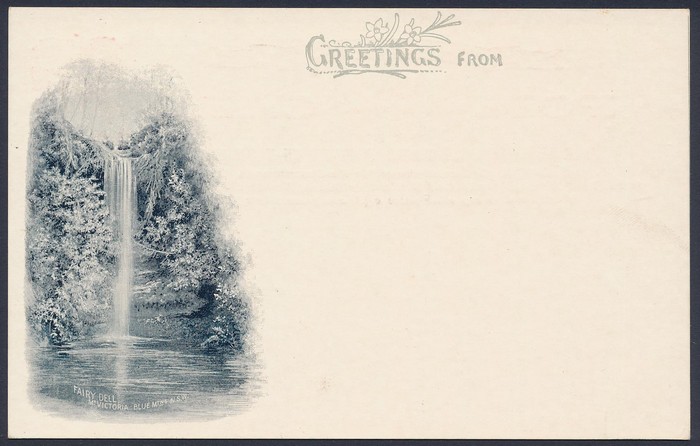1d red Die II with 3 extra lines of script text, view Fairy Dell (waterfall) in black, 'Greetings' in grey. View superb fresh UN, text side sm tones. PSSA PC27a.