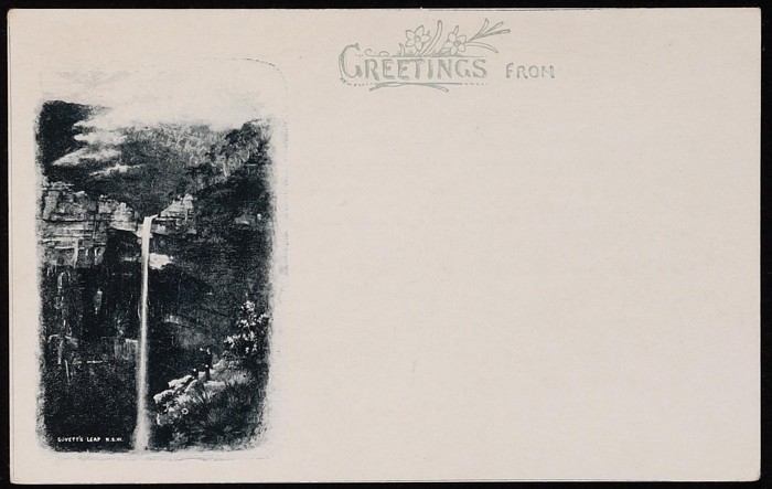 1d red Die II with 3 extra lines of script text, view Govett's Leap (waterfall) in jet black, Greetings in grey. VF fresh UN. PSSA PC27a. (Image1) (Image2)