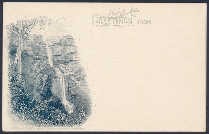 1d red die 2 with 3 extra lines of script text, view Katoomba Falls in black, 'Greetings' in grey. Superb fresh UN. PSSA PC27a. (Image1) (Image2)