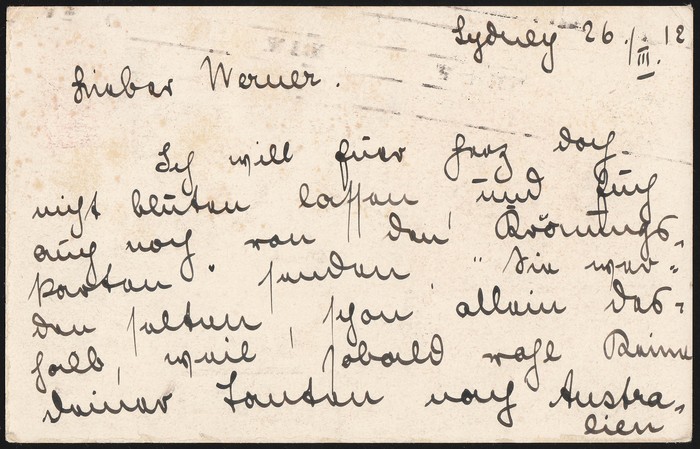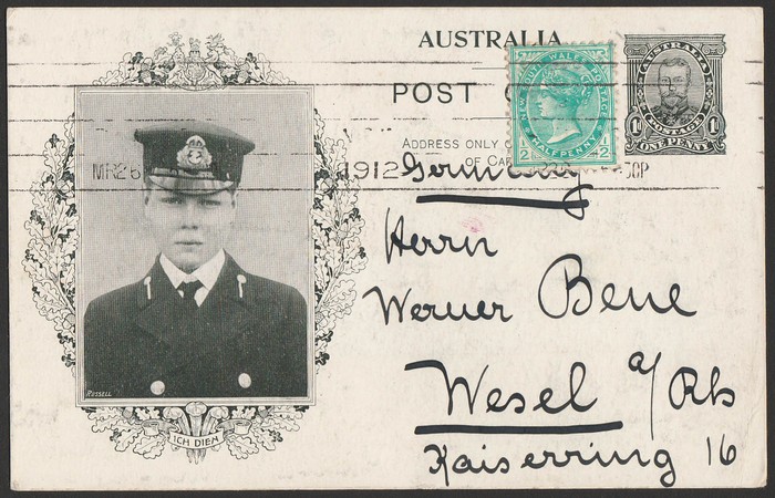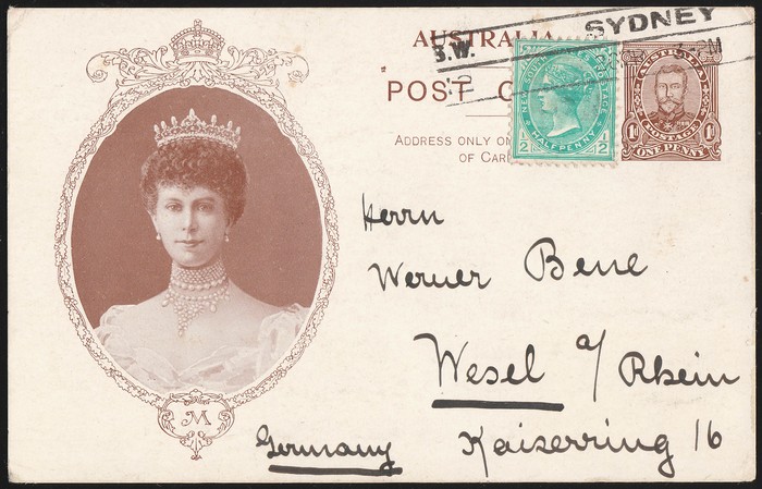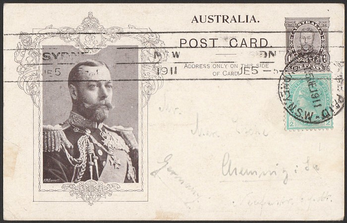 Coronation 1d purple-black King 50mm head in rectangle with shaded arms, type 2, white reverse. FU, uprated NSW QV ½d tied by 'Sydney JE 5 1911' pmk & Postage Paid cds. To Germany. ACSC P6(2)A cat $75+, plus premium for scarce mixed franking.