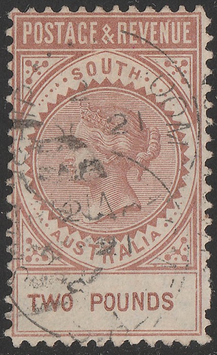 & Revenue £2 Venetian red perf 10, wmk 'crown/narrow SA' sideways. Postally GU, tear & crease, 'Wallaroo 22 DE 96' squared circle pmk & crayon line. Scott 86a cat US$575. SG 200 cat £650. Rare genuine used. (P) (Image1)