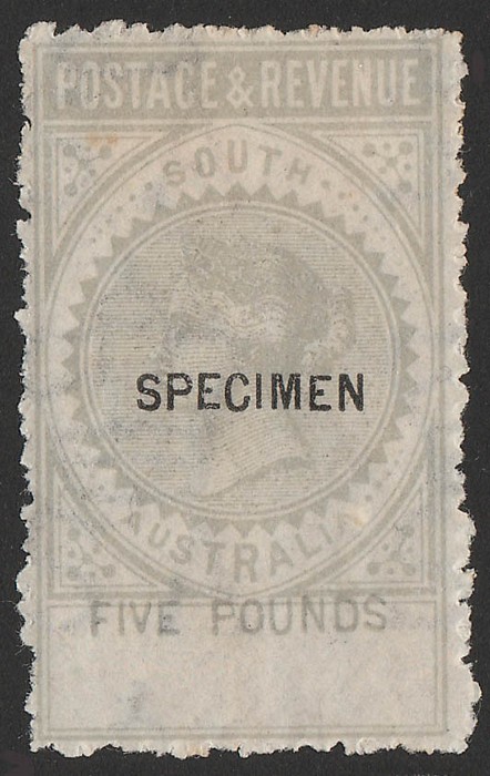 & Revenue £5 grey, opt SPECIMEN (12½x2mm) variety value SHIFTED upwards, wmk crown wide SA upright, rough perf 11½. VF fresh M. SG 204as(var) normal cat £11,000. Only 1 shee believed to have existed. (P) (Image1)