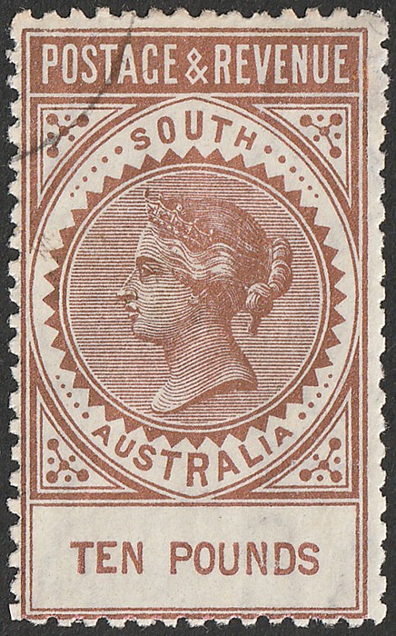 & Revenue £10 bronze, wmk crown / narrow SA upright, perf 11½. VFU/CTO, with gum, blank portion of cds, nice metallic sheen. Scott 91 cat US$1450. SG 206a cat £1500. Rare high value. (P) (Image1)