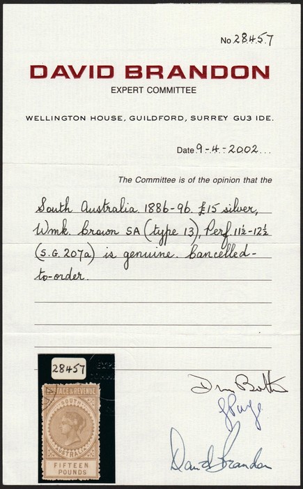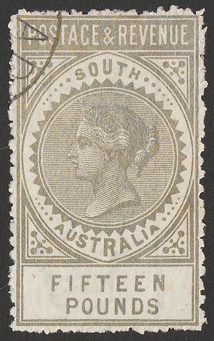 & Revenue £15 silver, perf 11½, wmk crown narrow SA upright. Superb fresh VFU/CTO part of Adelaide cds, excellent metallic sheen. Scott 92 cat US$2600, SG 207a cat £2500+ & undercatalogued. Very rare ultra-high value in pristine