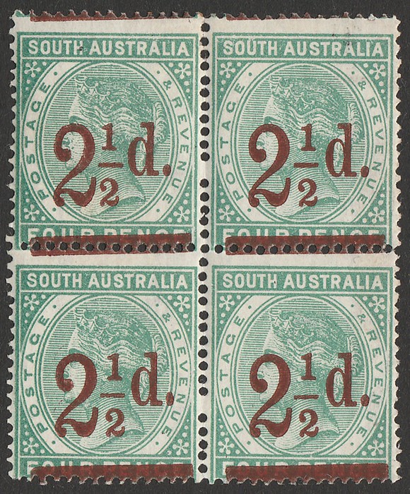 '2½d' opt QV 4d green blk of 4, perf 15, UL stamp variety '2' & '1½' closer F-VF fresh 2M/2MNH. SG 233/233b cat £310 for m singles, MNH should be at least double, £430, plus premium for blk. (P) (Image1)