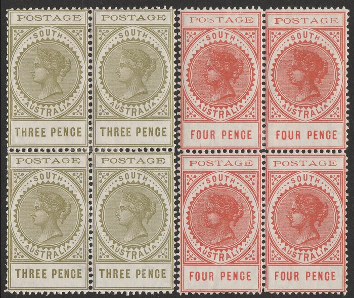 Postage 3d, 4d, 6d & 9d, blks of 4. VF fresh M/MLH, 3d sl horiz gum crease on 2. SG 268-70, 273 cat £372. ACSC S18, S20, S23, S27 cat $560, plus premium for blks. (4 blks). (P) (Image1) (Image2)