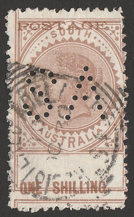 Postage 1/- brown perf SA, error 'misplaced 'ONE SHILLING' & 'POSTAGE' with latter being over design at top instead of within the tablet area. VFU, Adelaide squared circle pmk. SG 275(var), ACSC S30s(OS) cat $3000+. Extremely rare with only several