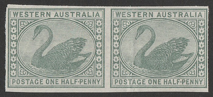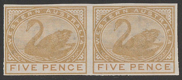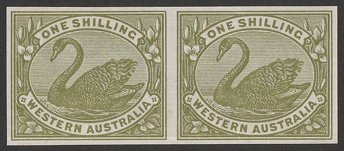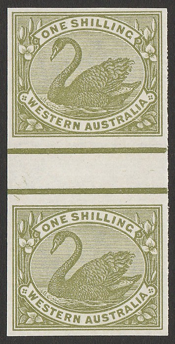 olive-green, IMPERF vert gutter pr, wmk W crown A, from DLR archive imprimatur sheet. Superb fresh MNH, all 4 margins. SG 116(p). Rare, only 1 sheet existed & only several gutter prs are recorded. (P) (Image1)