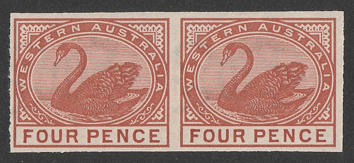chestnut IMPERF horiz pr, wmk crown CA, from DLR archive imprimatur sheet. Superb fresh MNH, all 4 margins. SG 98(p). rare, only 1 sheet existed. (P) (Image1)