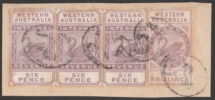 Revenue 5/- dull purple, Postal Fiscal, plus 6d dull purple (3) wmk CA crown, tied together on piece by oval 'R' pmks. Postally GU, some flts but still attractive. SG F14 cat £75+++ for 6d as loose stamps while 5/- is unlisted. Rare franking.
