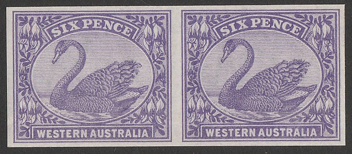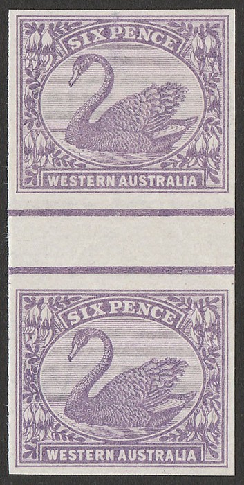 bright violet, IMPERF vert gutter pr, wmk W crown A, from DLR archive imprimatur sheet. Superb fresh MNH, all 4 margins. SG 115(p). Very rare, only 1 sheet existed & only several gutter prs recorded. (P) (Image1)