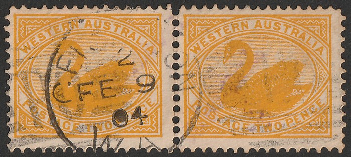 'Medical' h/s opt on 1902-11 Swan 2d horiz pr, wmk V/Crown sideways, perf 12½. VFU, 'Geraldton 2 FE 9 04' cds. SG 118(var). Rare provisional used by the WA Health Dept. (P)