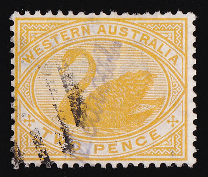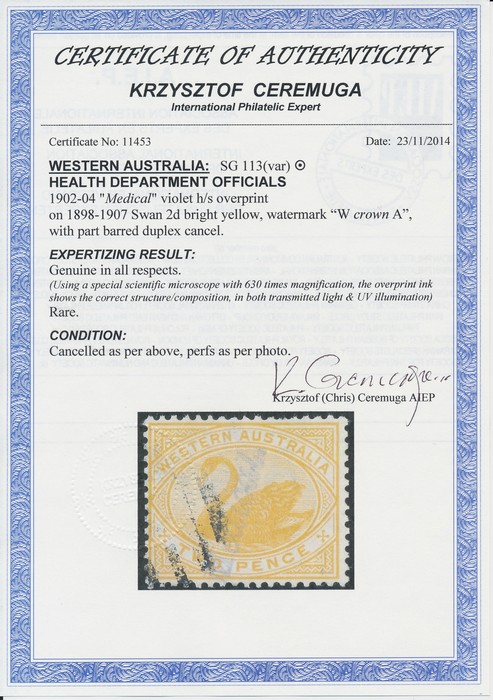 'Medical' h/s opt on 1898-1907 Swan 2d bright yellow, wmk W crown A. VFU, barred pmk. SG 113(var). Rare provisional used by the WA Health Department. 2016 Ceremuga AIEP photo cert. (P) (Image1) (Image2)