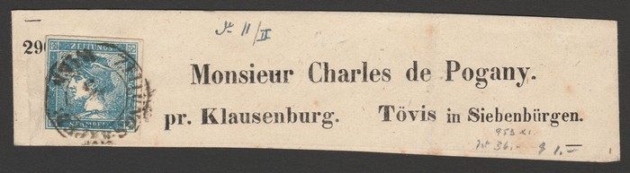 Mercury type I (4 margins) tied to wrapper/ band by 'Zeitungs Exped Wien' cds. Scott P1 cat US$240, SG N11 cat £550. Mi 6 cat €350 all for on wrapper. (P)