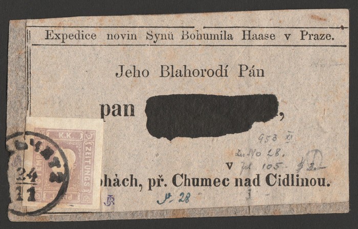 1K.05 grey-lilac (4 huge margins) tied to address label by part cds. VFU. Scott P6 cat US$300+, SG N29a cat £750+. Mi 17 cat €700+ all as loose stamp, plus premium for proper usage on newspaper address label. (P) (Image1)