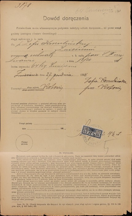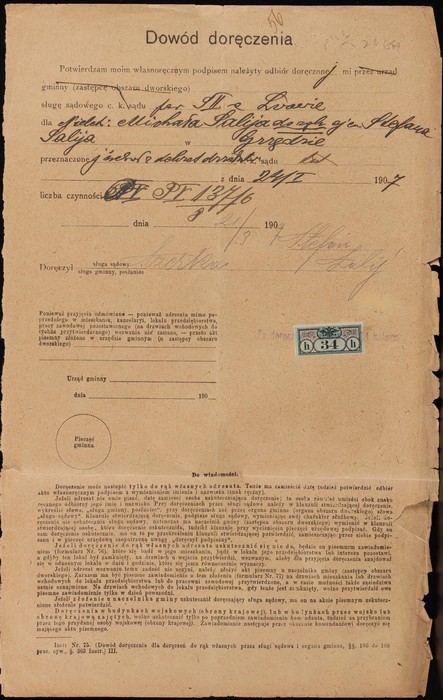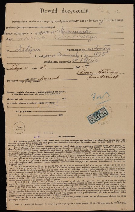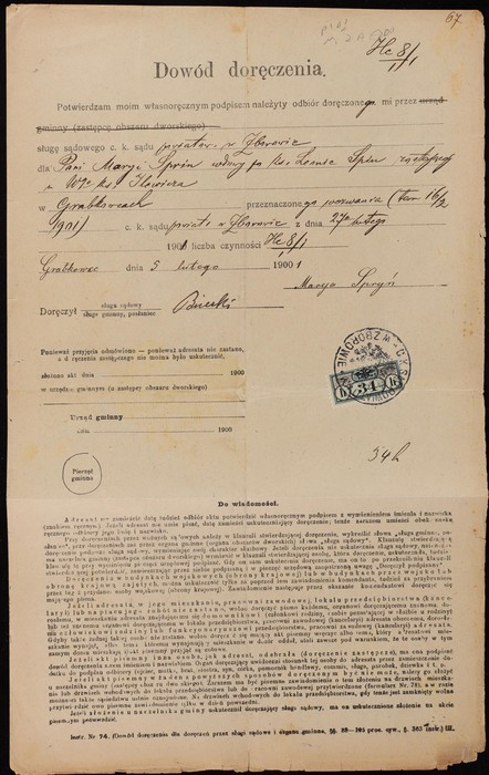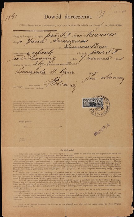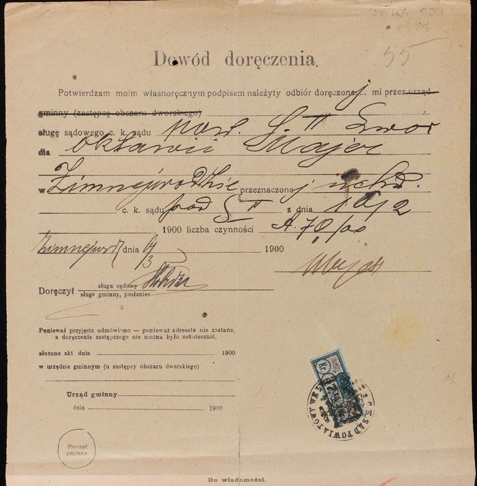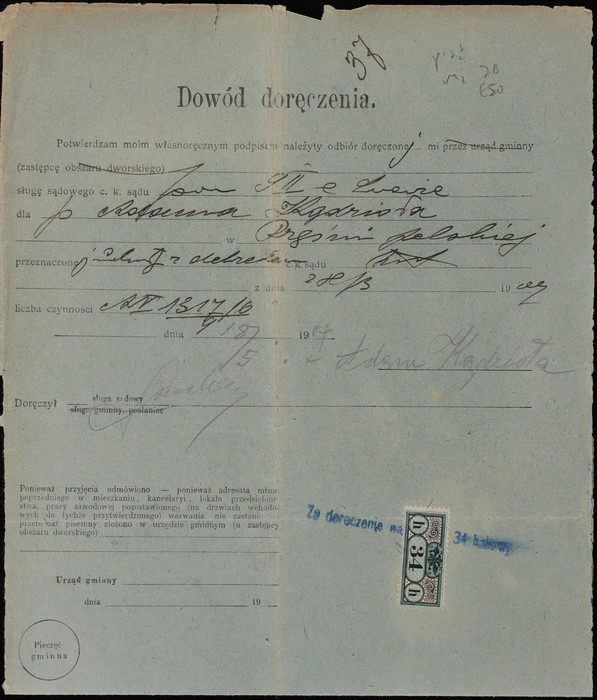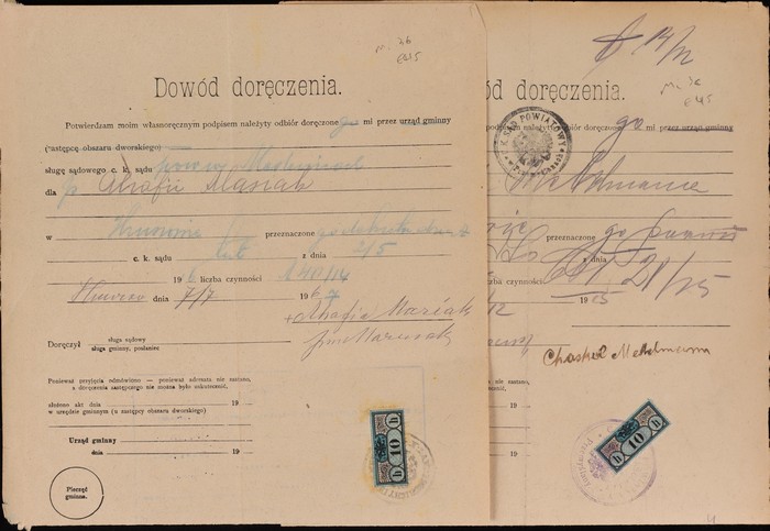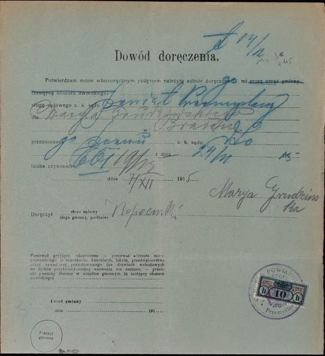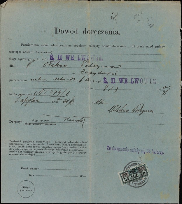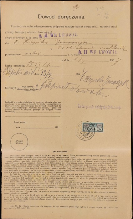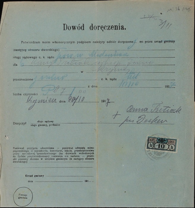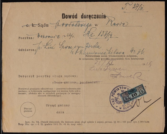 Delivery form franked Austrian Court Delivery Stamp 10h bright blue, tied by 'Sad Powiatowy Rawia Ruska' violet Polish eagle h/s. Mi 3a. Scarce provisional usage.