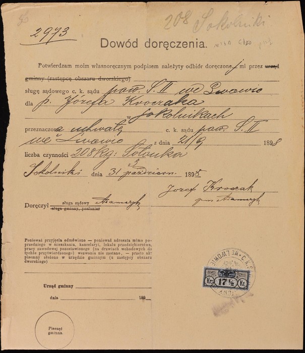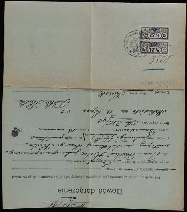 delivery forms franked Court Delivery stamps with 1898 use of 17½Kr blue-violet perf 12½, & use of 17½Kr blue perf 10½. 1901 use of 34h perf 10½, 1907 34h perf 12½(2) & 1902 34h perf 12½-10½.