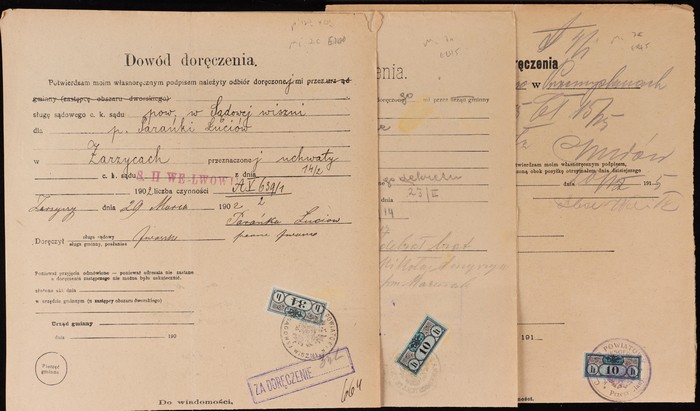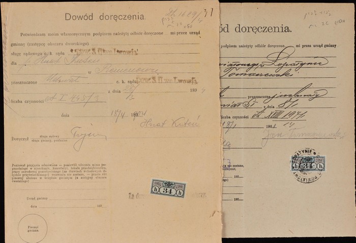 delivery forms franked Court Delivery stamps with 1898 usage of 17½Kr blue-violet (vert pr), 1917 10h blue, 1915 10h blue, 1904 & 1907 34h blue perf 12½. MI 1bB, 2B(2), 3b, 3c cat €350. All from towns in Eastern Galicia (later