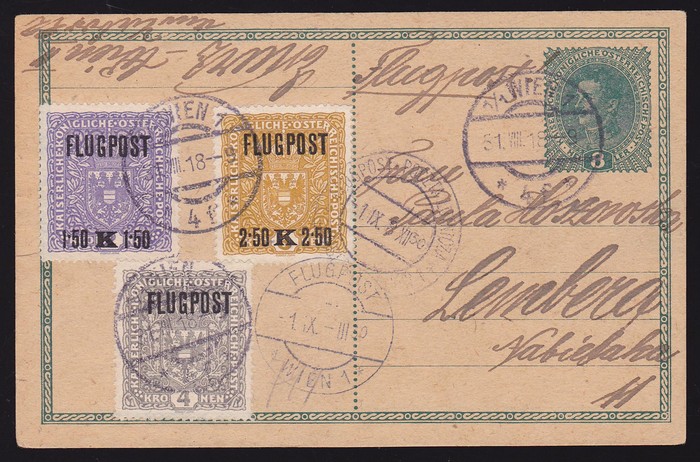 Airmail flight postcard franked Flugpost opt set 1.50Kr/ 2Kr, 2.50Kr/3Kr & 4Kr all white paper on Karl 8h postcard tied by 'Vienna 31 VIII 18' cds with 'Flugpost Poczta Lotnicza Lemberg Lwow 1 IX 18' cds & with 'Flugpost Wien 1 IX' cds. To Lemberg