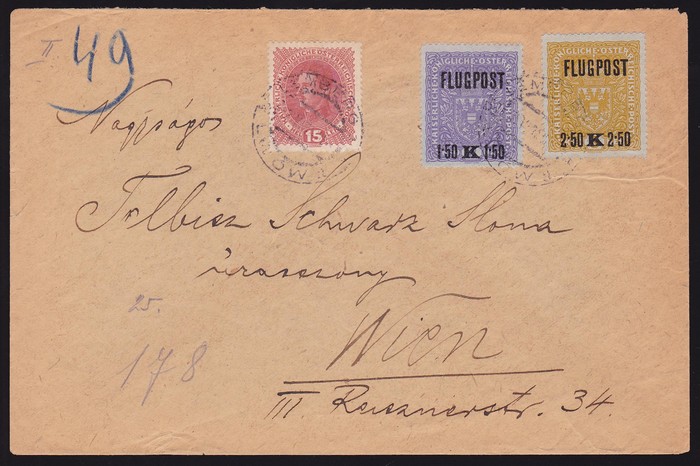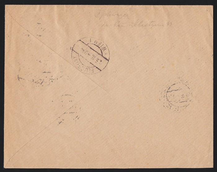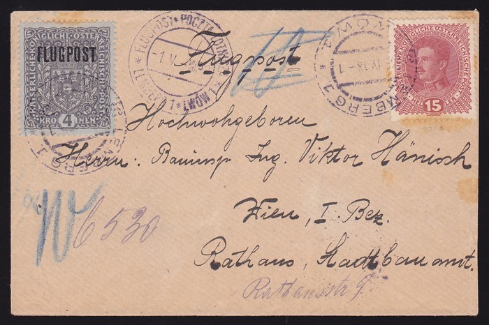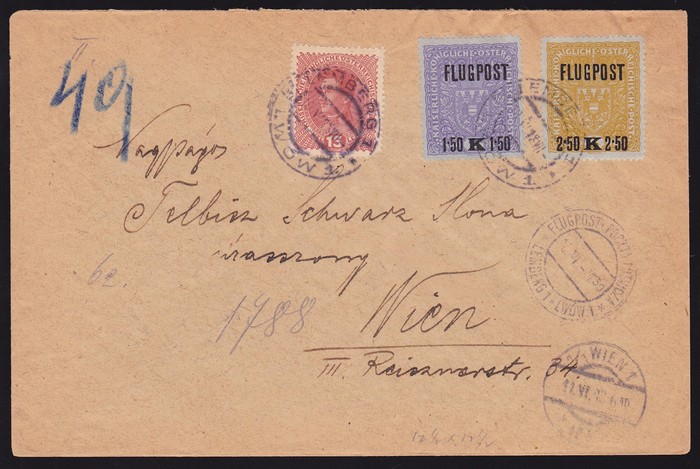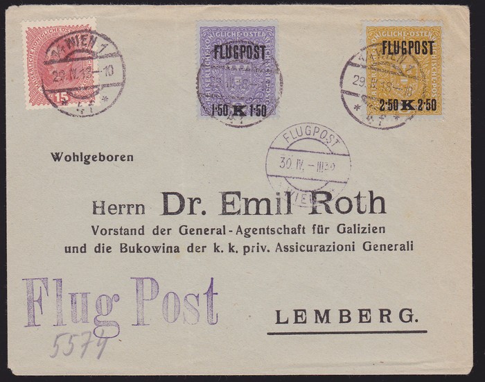 airmail flight cover franked Flugpost opt 1.50Kr/2Kr, 2.50Kr/3Kr, grey paper, plus Karl 15h, tied by 'Wien 29 IV 18' cds & with 'Flugpost Wien' cds. To Lemburg (then in Poland, now Ukraine), with Flugpost Lemberg-Lwow arrival b/s. Mi 225xA & 226xA