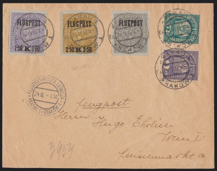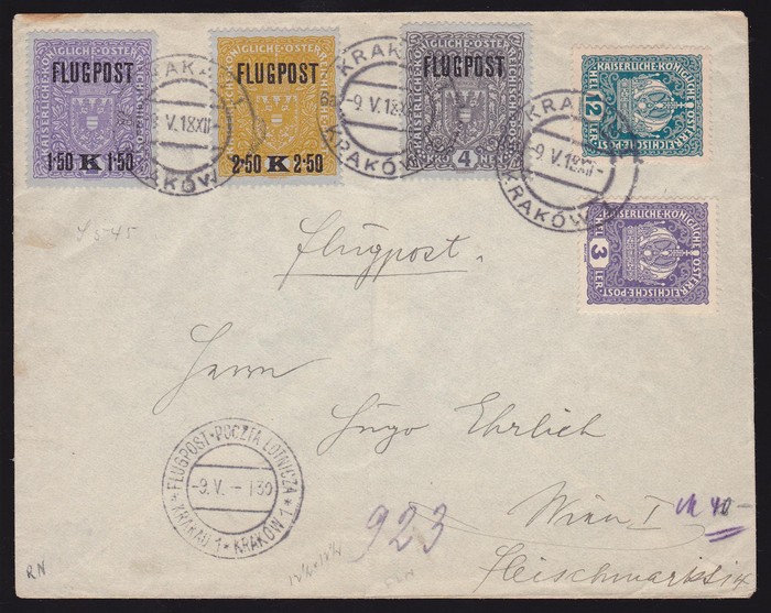 Airmail flight cover franked Flugpost opt set 1.50Kr/ 2Kr, 2.50Kr/3Kr & 4Kr, all grey paper, plus crown 3h & 12h, tied by 'Krakau 9 V 18' cds (Poland) with 'Flugpost Poczta Lotnicza Krakau Krakow 9 V 18' cds. To Vienna with 'Flugpost Wien 9 V 18'