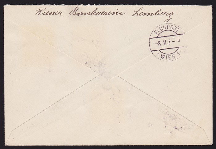 airmail flight cover franked Flugpost opt set 1.50Kr/2Kr, 2.50Kr/3Kr & 4Kr -all grey paper, plus Karl 15h, tied by 'Lemberg 7 V 18' cds (then in Poland, now Ukraine), & with 'Flugpost Lemberg-Lwow' cds. To Austria, with 'Flugpost Wien' arrival b/s.