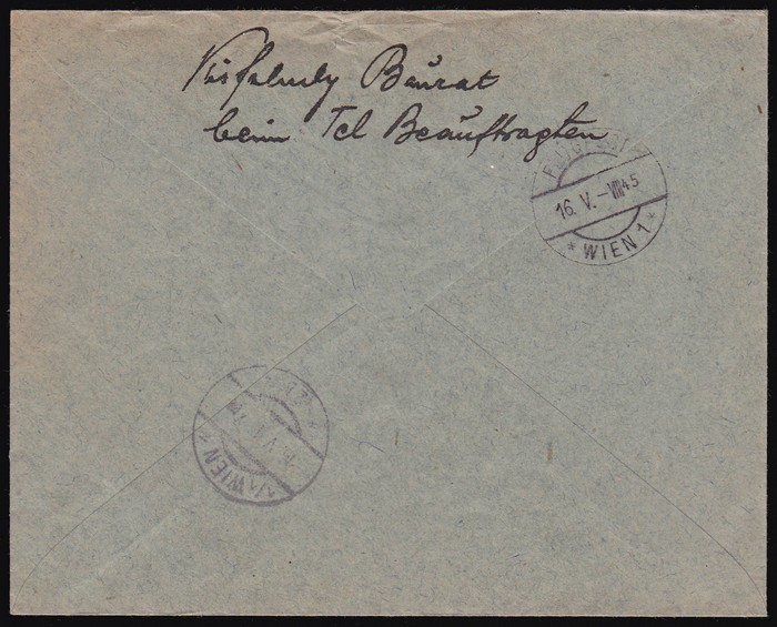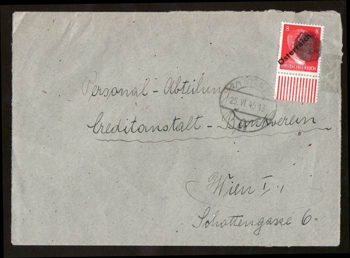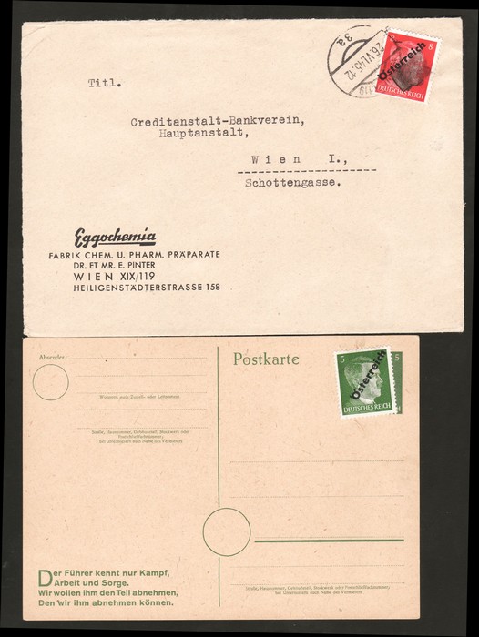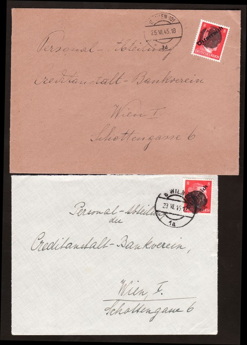 'Osterreich' opt Hitler 8pf with Hitler blotted out, tied by Wien cds of 23rd-26th June 1945, plus Hitler 5pf Postal card with Osterreich opt 5pf affixed over original stamp imprint UN. (5). (Image1) (Image2)