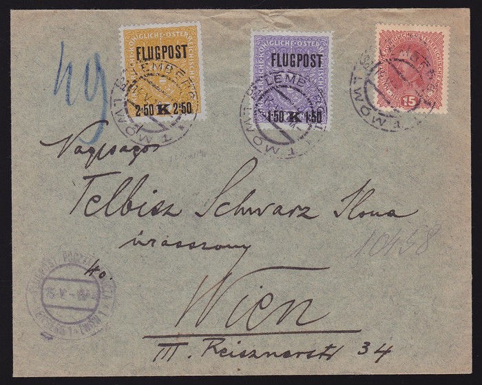 Airmail flight cover franked Flugpost opt 1.50Kr/2Kr & 2.50Kr/3Kr (scarce perf 12½x11½), plus Karl 15h, tied by 'Lemberg 14 V 18' cds (was in Poland, now Ukraine) with 'Flugpost Poczta Lotnicza Lemberg Lwow 15 V 18' cds. To Vienna with