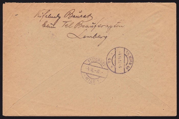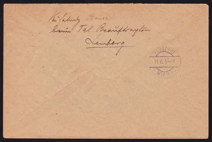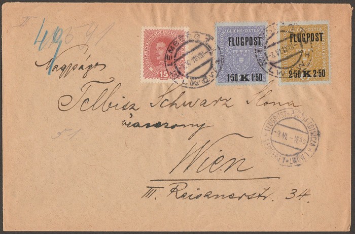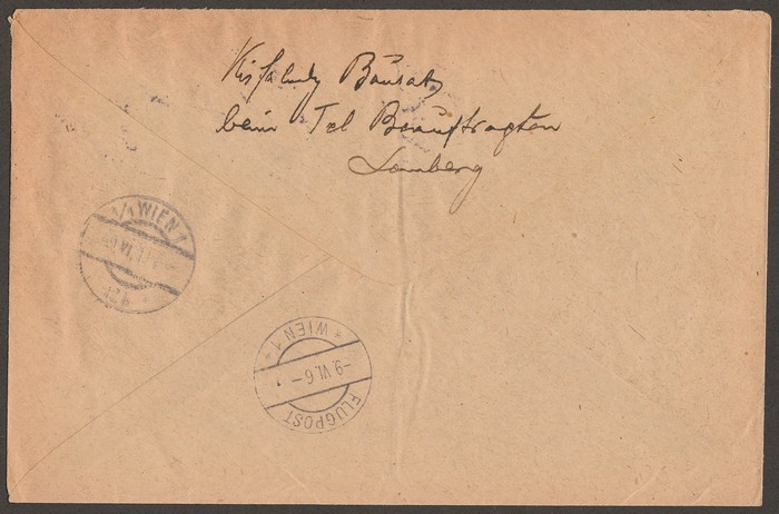 Airmail flight cover (centre fold) franked Flugpost opt 1.50Kr/2Kr & 2.50Kr/3Kr, plus Karl 15h, tied by 'Lemberg 8 VI 18' cds (was in Poland, now Ukraine) with 'Flugpost Poczta Lotnicza Lemberg Lwow 9 VI 18' cds. To Vienna with 'Flugpost Wien 9 VI