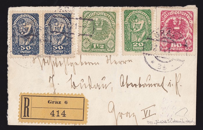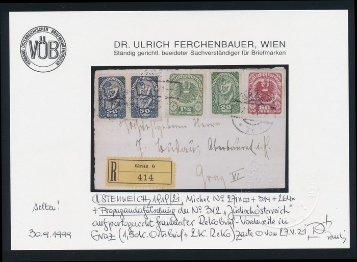 cover front franked 'New Republic' 20h, 50h pr & Arms 1½Kr, plus 80h Anti-Semitic propaganda forgery inscribed 'Judisch-Osterreich' instead of 'Deutsch-Osterreich' (Jewish-Austria instead of German-Austria), tied by 'Graz 27 V 21' cds & with