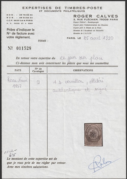 Flowers 1/- scarlet-vermilion. VFU appearance with expertly repaired (tear at right), 4 margins, barred oval pmk, nice bright colour. SG 9 cat £9000. Unitrade 9 cat C$15,000/7,500 for this condition. Rare genuine classic top value. 1990 Calves
