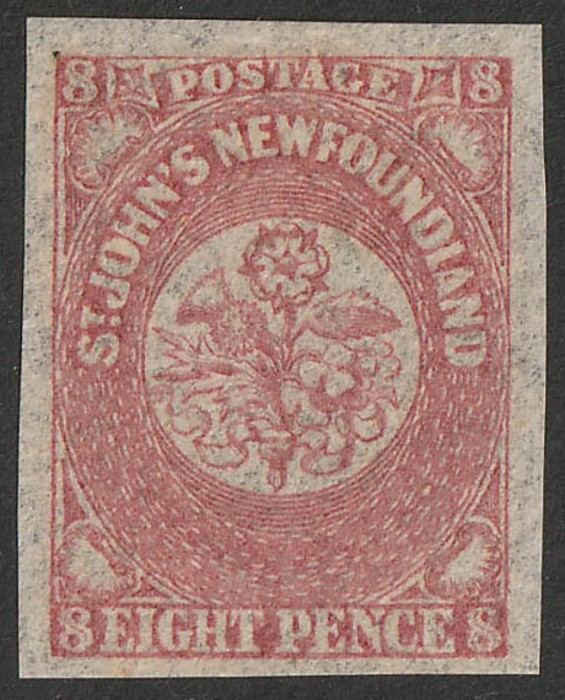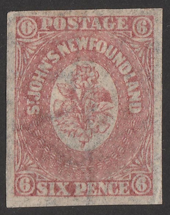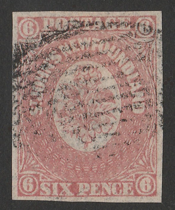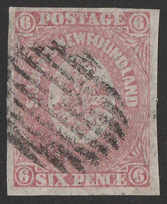 rose-lake. VFU, 4 margins, barred oval pmk. Unitrade 20 cat C$80, SG 20 cat £100. (Image1)