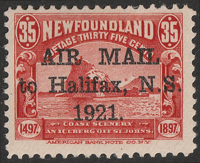 Airmail opt 35c red, 1½mm spacing between 'AIR' & MAIL', varieties no stop after 1921 & 1st '1' of 1921 under F of Halifax. VF fresh MLH. SG 148fh cat £375. Unitrade C3j cat C$600. (P) (Image1)
