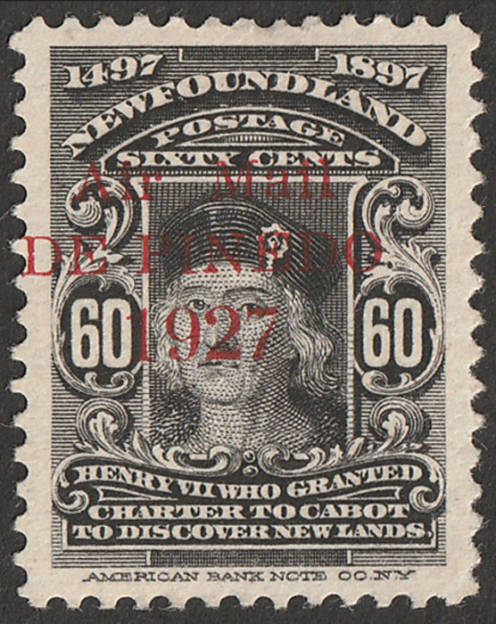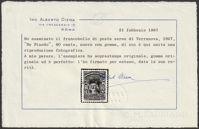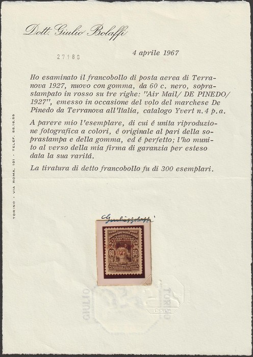 Airmail Flight 'Air Mail / DE PINEDO / 1927' red opt 60c black. Superb fresh M, original gum & exceptional centring. SG 163 cat £42,000++, Unitrade C4 cat C$70,000++, plus significant premium for the superb centring. Only 300 printed of which