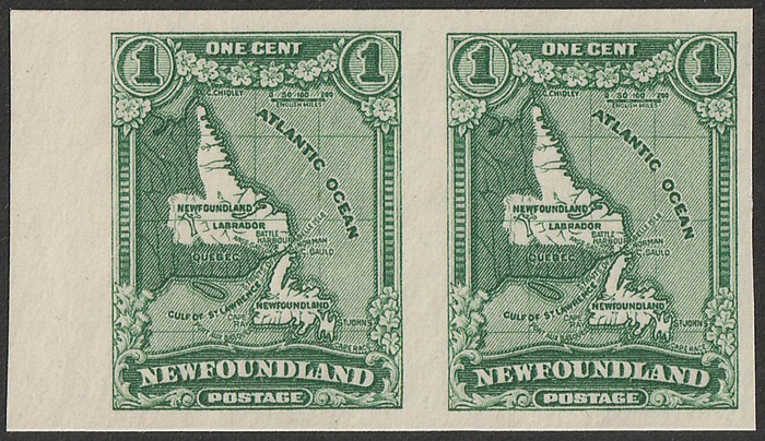Issue 1c green Map, re-engraved, horiz IMPERF pr. Superb UN as made, all 4 margins. SG 179c cat £160. Unitrade 163c cat C$160 for UN. (P) (Image1)