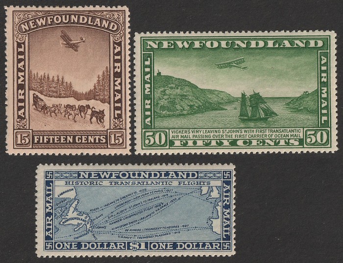 wmks. 1932 Trans-Atlantic opt $1.50 on $1. 1932 Labrador Air Wayzata $1 blk of 4 labels. 1933 Pic Air set to 75c. F-VF M/U, mostly fresh. SG cat £1275+ = A$2550+. Unitrade cat C$1400. (22) (P) (Image1) (Image2)