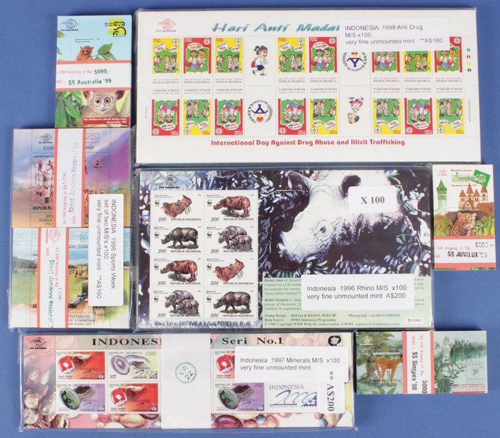 421 image1990s MNH M/Sheets of Indonesia with1997 Minerals M/Sheet of 9, plus label (SG 2312(var) cat £1050), 1996 Rhino M/S of 8 stamps (100), SG 2267a £650, 1996 Sports Week M/S set of 2 with Istanbul 96 opts (SG MS2266 cat £650), 1998 Anti-Drug sheetlet of 8 Tete-Beche prs (SG 2415a, £1120), 1998 Juvalex & Singpex M/S (100 of ea, £825). 1999 'Australia 99' 5000Rp M/S (100, £350). Fresh MNH in neat bundles of 100. Total SG £4645 = A$8400. Zonnebloem cat €3560 = A$5700. (800 M/S) (Image1)