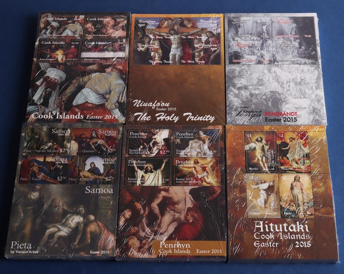 424 image2015 Pacific Islands Easter Celebrations M/Sheets for Aitutaki, Cook Is, Niuafo'ou, Penrhyn, Samoa & Tonga with 100 M/Sheets of ea. SG cat £5600 = A$11,200, with Penrhyn, Aitutaki & Cook Is FV NZ$2400. (600) (Image1)