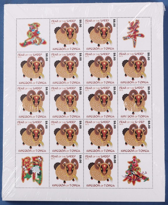 425 image2015 Tonga $8.00 Lunar New Year of the Sheep full sheet of 16 x 100, MNH. FV alone TOP $12,800 = A$8300.00. SG cat £12,000 = A$24,000. (1600 stamps) (Image1)