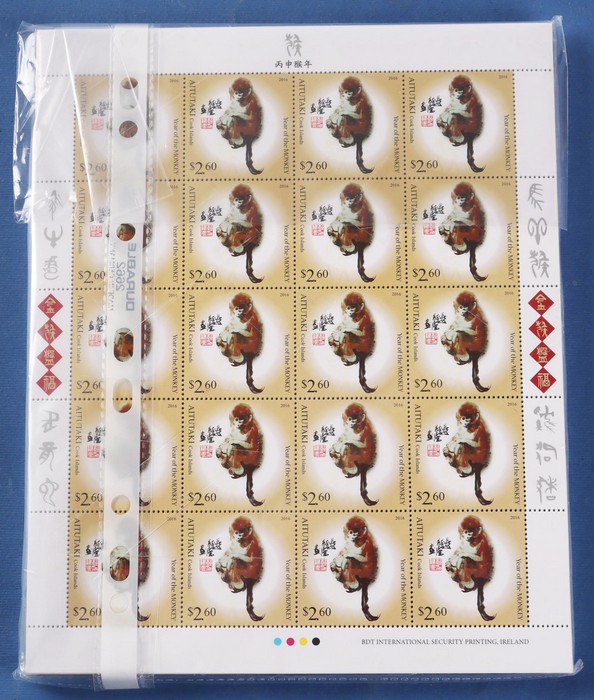 426 image2016 Lunar New Year of the Monkey. 200 comp fresh MNH sets of 2 in sheetlets of 20 from Aitutaki, Cook Islands, Samoa, Penrhyn, Tonga & Niuafo'ou. SG cat £10,900 = A$21,500. (1200 sets = 2400 stamps) (Image1)