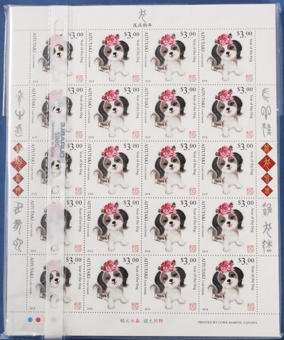 428 image2018 Lunar New Year of the Dog. 200 comp fresh MNH sets of 2 in sheetlets of 20 from Aitutaki, Cook Is, Penrhyn, Tonga & Niuafo'ou. SG cat £11,000 = A$22,000. (1000 sets = 2000 stamps) (Image1)