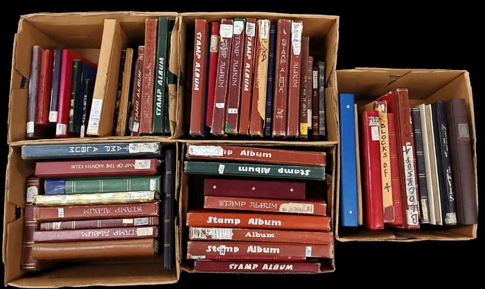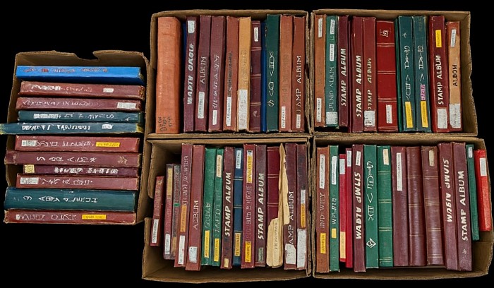 434 image5 Archive cartons: World & Australia in 63 Albums & Stockbooks, 42 large & 21 small. Vendor-sorted and not closely inspected by us. Inc Australia Kangaroos inc 1d (few 100) ,KGV ? modern (pre-decimal/decimal, commemoratives, ATM / ?Postage Paid? labels) plus range of world incl. France, Norway, Portugal, Indonesia, Egypt & New Guinea, Romania, USA, Hungary?and many more countries with lots of different world stamps as well. Binders sighted include multiple red ?Stamp Album? volumes, green/blue stockbooks, a Concord 1938/1947, Stamp of the Month Club, and a ?Blocks of 4? book. Mixed mint/used with duplication and part-sets; usual mixed condition. Basically unchecked and offered strictly as received. (Estimate 10000+ in 63 albums) (Image1)