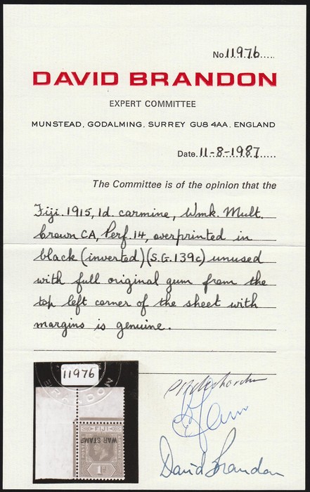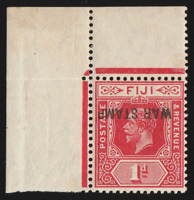opt KGV 1d bright scarlet, error opt INVERTED. Stamp VF MNH, UL cnr marginal. Scott MR2c cat US$800 for M, SG 139ac cat £600 for M, should be at least double, £1200 MNH. Brandon photo cert. (P) (Image1) (Image2)