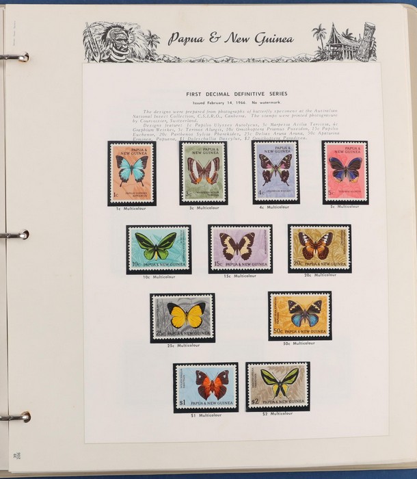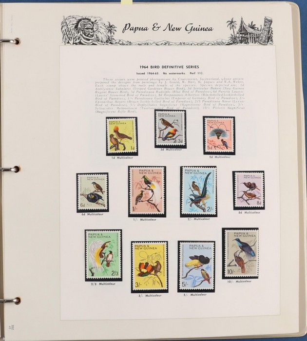 442 Australian Territories: PNG, Norfolk & others plus some GB in 6 s/books & hagner binders. Inc PNG 1952-82 comp inc 10/- Map & Rabaul & £1 Fisherman Queen Specimens. Norfolk 1947-82 comp inc 47 Ball Bay set to 2/- imprint blks of 4, 2d white paper M, other Territories to 1982 plus dozens of extra sets plus some Australian decimals & few 100 GB MNH decimals. Condition mostly MNH, few M, but some toning effecting some better stamps, also a small percentage used. (Many 100s)